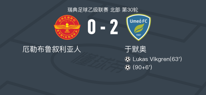 在瑞典足球乙级联赛北部第30轮的比赛中,厄勒布鲁叙利亚人坐镇主场迎战于默奥。比赛中,于默奥的Lukas Vikgren率先为球队打破僵局。随后,于默奥在比赛接近尾声时再下一城,锁定胜局。最终,厄勒布鲁叙利亚人以0-2不敌于默奥。
