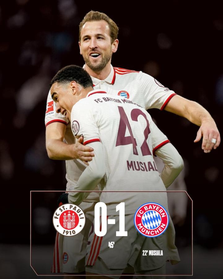 在德甲第10轮拜仁慕尼黑客场与圣保利的比赛中,两队前45分钟均未创造出太多机会,最终拜仁依靠穆西亚拉第22分钟的世界波破门,客场1-0领先圣保利结束上半时的比赛。