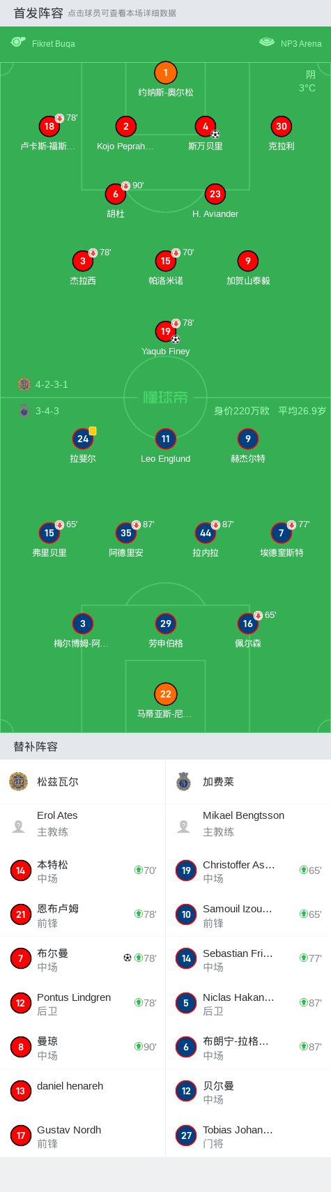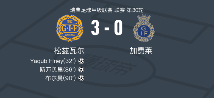在瑞典足球甲级联赛第30轮的比赛中,松兹瓦尔坐镇主场迎战加费莱。比赛中,松兹瓦尔展现了强大的进攻实力。首先,Yaqub Finey为球队首开纪录,随后斯万贝里再下一城,进一步扩大了领先优势。比赛接近尾声时,布尔曼的进球为松兹瓦尔锁定胜局。最终,松兹瓦尔以3-0的比分完胜加费莱,取得了一场令人振奋的胜利。