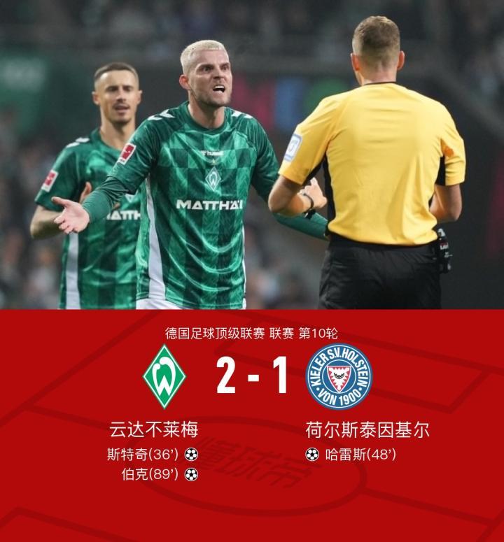 在德国足球顶级联赛第10轮的比赛中,云达不莱梅坐镇主场迎战荷尔斯泰因基尔。比赛中,云达不莱梅的斯特奇率先为球队取得领先。随后,荷尔斯泰因基尔的哈雷斯在马克斯-格施威尔的助攻下扳平比分。比赛接近尾声时,云达不莱梅的伯克在科克-托普的助攻下打入制胜一球。最终,云达不莱梅以2-1战胜荷尔斯泰因基尔。