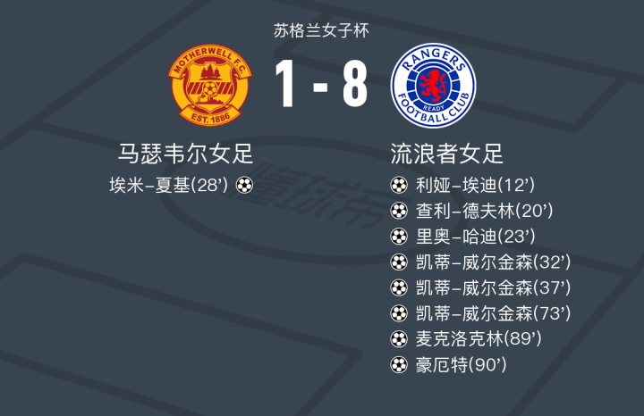 在苏格兰女子杯的较量中,马瑟韦尔女足迎战流浪者女足。比赛中,马瑟韦尔的埃米-夏基成功破门,为球队贡献了一粒进球。然而,流浪者女足展现了强大的进攻实力。利娅-埃迪、查利-德夫林和里奥-哈迪各自攻入一球,凯蒂-威尔金森更是上演了帽子戏法,成为比赛的焦点。此外,麦克洛克林和豪厄特也各自取得进球。最终,流浪者女足以8比1的比分大胜马瑟韦尔女足。