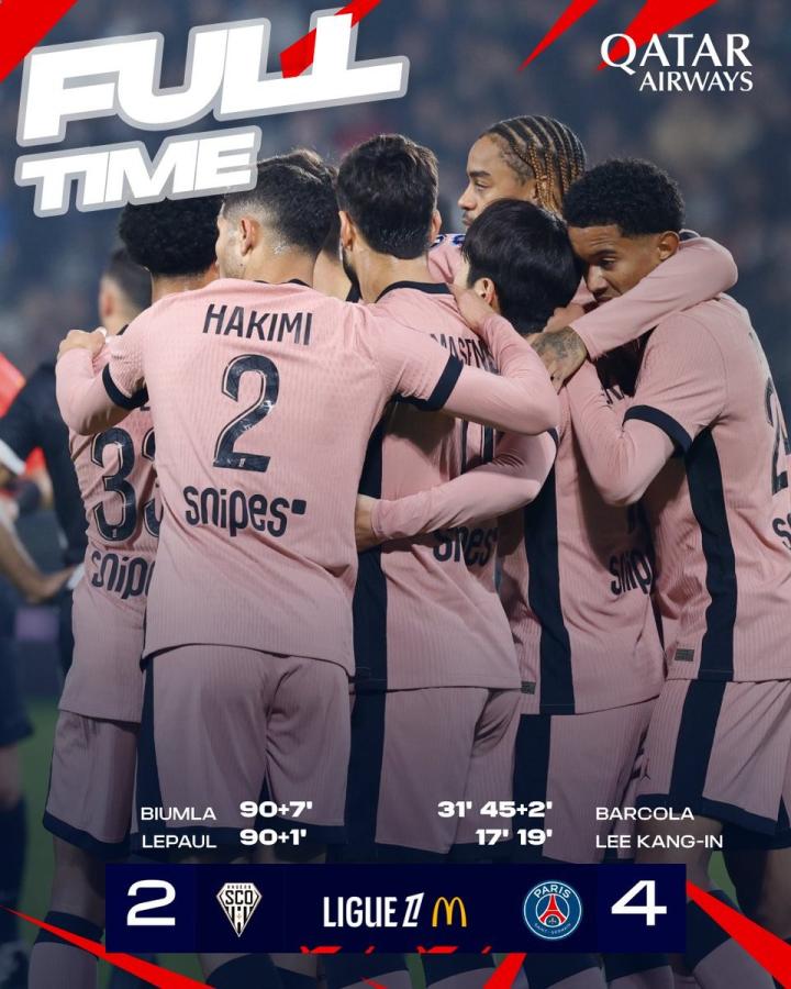此役客场对阵昂热,一度取得4-0领先在巴黎圣日耳曼在比赛下半场补时阶段连丢两球。