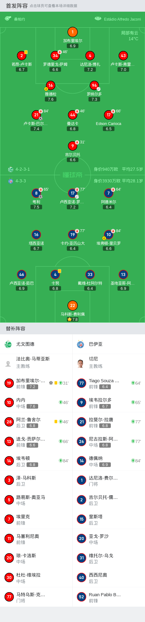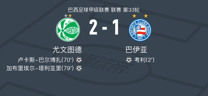 在巴西足球甲级联赛第33轮的较量中,尤文图德坐镇主场迎战巴伊亚。比赛伊始,巴伊亚的考利在队友卢西亚诺-罗德里格斯的助攻下率先为球队取得领先。随后,尤文图德展开反击,卢卡斯-巴尔博扎接到内内的传球,成功扳平比分。紧接着,加布里埃尔-塔利亚里在罗纳尔多的助攻下再下一城,为尤文图德反超比分。最终,尤文图德以2-1战胜巴伊亚,取得了本场比赛的胜利。