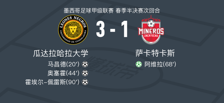 在墨西哥足球甲级联赛春季半决赛次回合的较量中,瓜达拉哈拉大学坐镇主场迎战萨卡特卡斯。比赛中,瓜达拉哈拉大学的马昌德率先为球队打开局面,随后奥塞霍再下一城,扩大了领先优势。萨卡特卡斯的阿维拉通过点球为球队扳回一分。然而,瓜达拉哈拉大学的霍埃尔-佩雷斯再次破门,锁定胜局。最终,瓜达拉哈拉大学以3-1战胜萨卡特卡斯,两回合总比分5-3晋级。