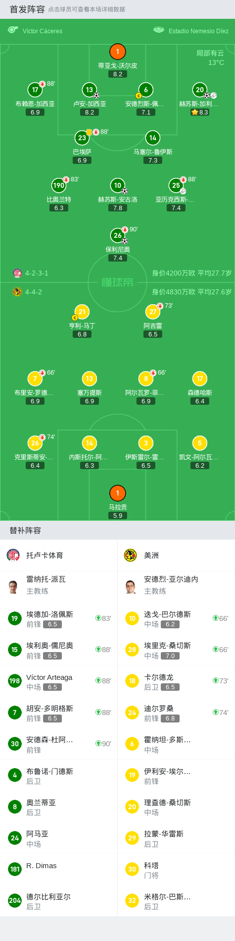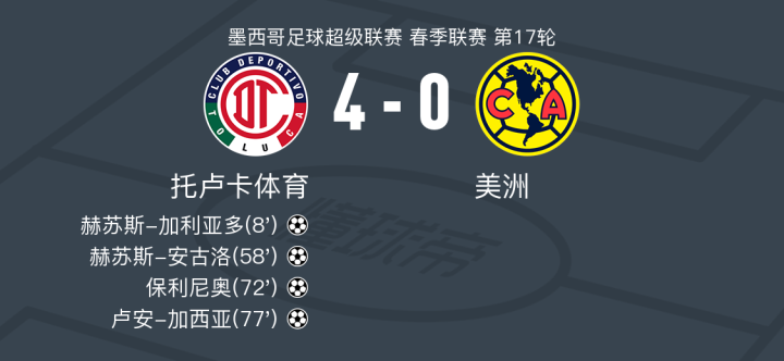 托卢卡体育4-0大胜美洲,卢安-加西亚、保利尼奥破门