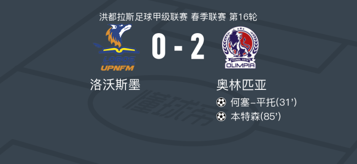 在洪都拉斯足球甲级联赛春季联赛第16轮的较量中,奥林匹亚队客场挑战洛沃斯墨队。比赛中,奥林匹亚的何塞-平托率先为球队打开局面,随后本特森再下一城,帮助球队锁定胜局。最终,奥林匹亚以2比0战胜洛沃斯墨,取得了本场比赛的胜利。