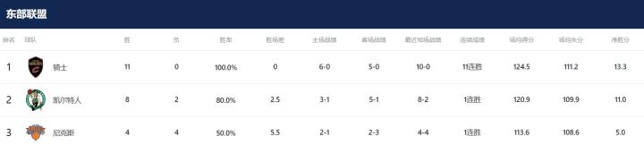 而在目前的东部排名中有些强弱分明,领头羊骑士11胜0负领跑全联盟,凯尔特人8胜2负紧随其后,但第三名尼克斯的战绩则已经来到了4胜4负,与前两名相差较大。