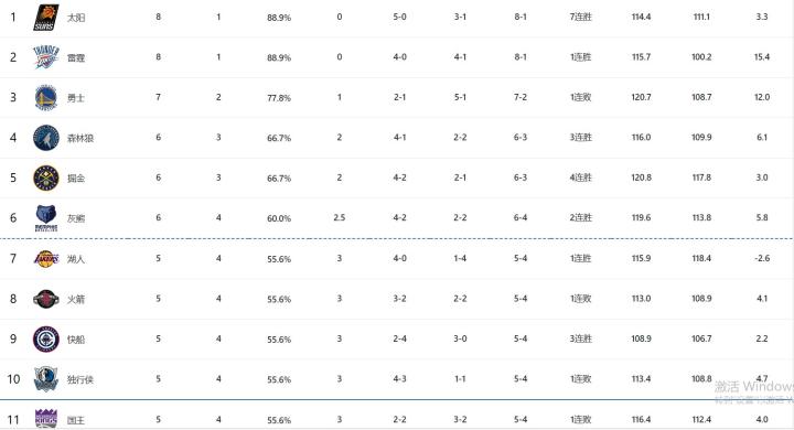 同时,东部第3尼克斯的战绩甚至不如目前的西部第11(5胜4负)。