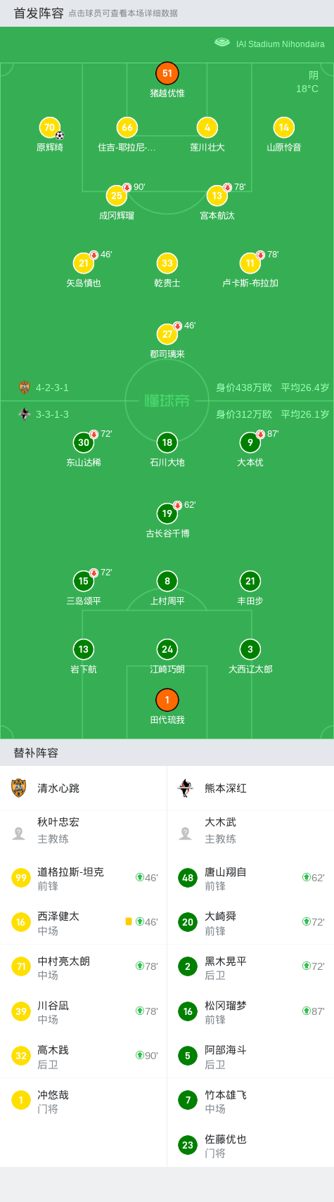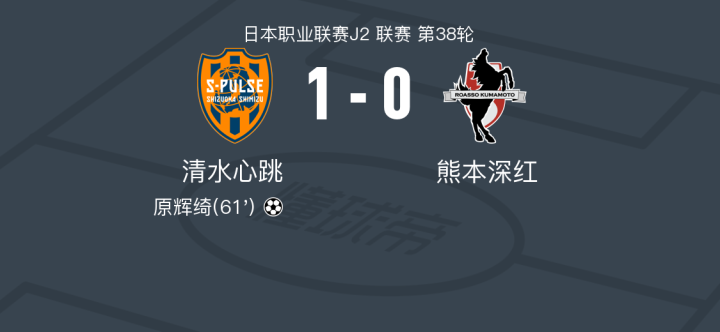 清水心跳1-0熊本深红,原辉绮打进全场唯一进球战报bot @懂球帝2024-11-10 14:54在日本职业联赛J2联赛第38轮的较量中,清水心跳坐镇主场迎战熊本深红。比赛中,清水心跳的原辉绮成功破门,为球队取得领先。最终,清水心跳以1-0战胜熊本深红,取得了本场比赛的胜利。点击查看本场比赛详细数据>>点击查看日职乙完整积分榜>>精彩瞬间第61分钟,清水心跳球员原辉绮打入一球。 球队阵容 技术统计 展开更多