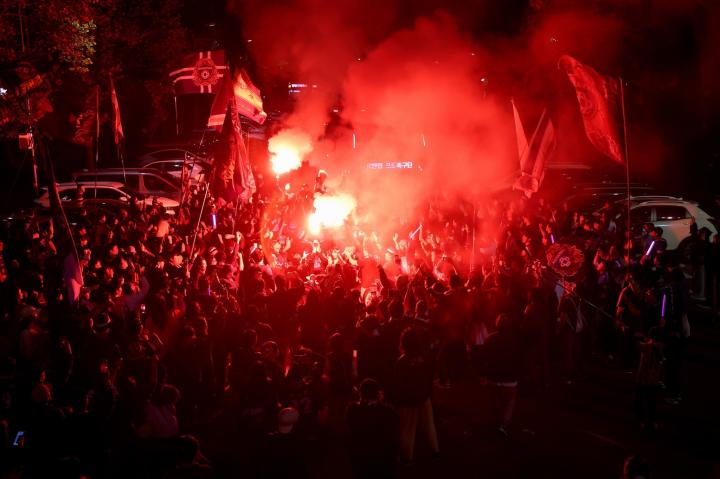 11月的韩国冬夜,气温已近零度,但这并不能阻挡安养球迷们的热情。在黑夜中,安养球迷们燃起焰火,载歌载舞。十余年的苦闷与心酸,在这一刻喷涌而出。这划破黑夜的冬日焰火,正如同无数个苦闷黑夜中的那一束光,照亮球队的前路。