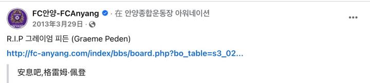 2013年,就在球队建立初期,FC安养官媒专门在球队社媒发文,纪念这位忠诚的安养球迷。