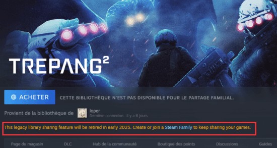 据玩家发现,V社已在Steam游戏页面提醒:旧版的库共享功能将于2025年初停用,官方提醒玩家去使用全新的家庭共享功能。