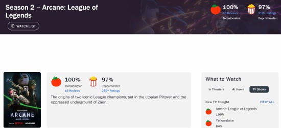 《英雄联盟》世界观衍生动画剧集《双城之战》第二季现已正式开播,腾讯视频和B站同步上线。目前本片在烂番茄的新鲜度为100%满分,观众爆米花指数也高达97%。