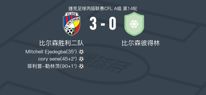 比尔森胜利二队3-0大胜比尔森彼得林,菲利普-勒林茨、cory sene破门