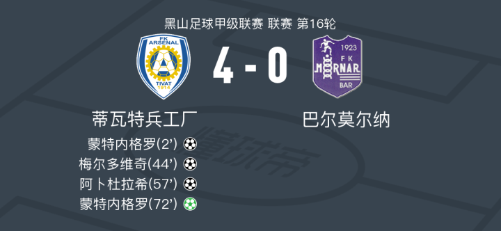 蒂瓦特兵工厂4-0大胜巴尔莫尔纳,蒙特内格罗双响,阿卜杜拉希破门