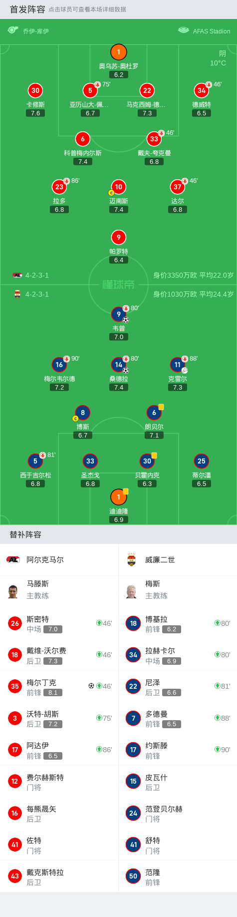 在荷兰甲级联赛第12轮的较量中,阿尔克马尔坐镇主场迎战威廉二世。比赛中,威廉二世的韦曾率先为球队取得进球,随后克雷尔助攻桑德拉再下一城,扩大了领先优势。阿尔克马尔方面,戴维-沃尔费为梅尔丁克送出助攻,帮助球队扳回一球。最终,威廉二世以2-1的比分战胜阿尔克马尔,取得了比赛的胜利。