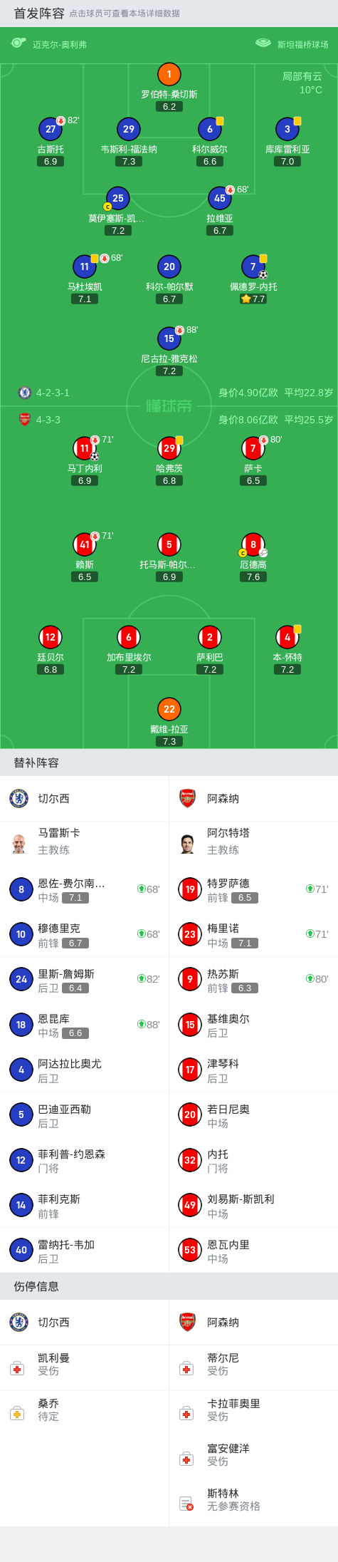 在英格兰足球顶级联赛第11轮的较量中,切尔西坐镇主场迎战阿森纳。上半场,古斯托近距离空门顶飞,马丁内利推射被桑切斯挡出,赖斯快发定位球助攻哈弗茨破门被吹越位进球无效;下半场,厄德高助攻马丁内利打近角破门,恩佐助攻内托远射破门扳平,雅克松单刀破门被判越位进球无效。最终,双方以1-1握手言和,未能分出胜负。