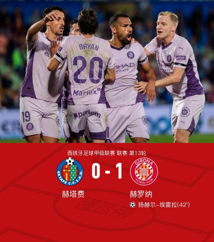 赫罗纳1-0客胜赫塔费,埃雷拉破门,布赖恩-希尔献助攻