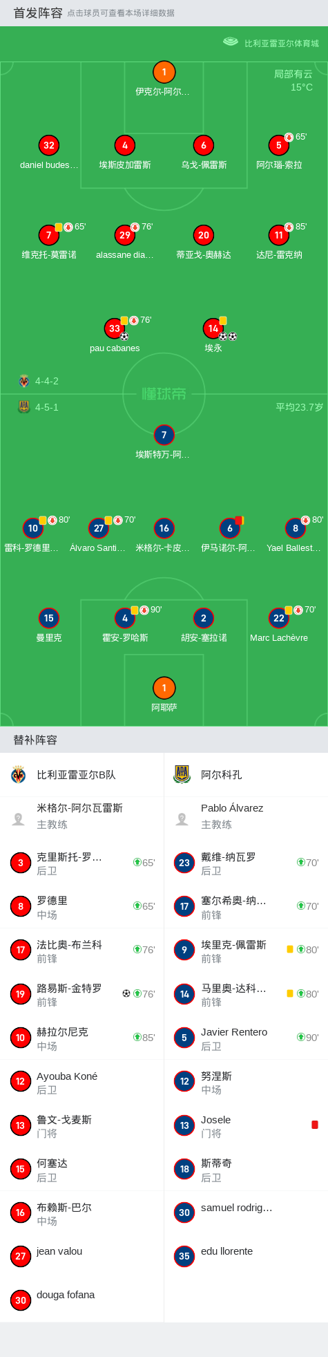 下半场补时第5分钟,比利亚雷亚尔B队球员埃永打入一球。
