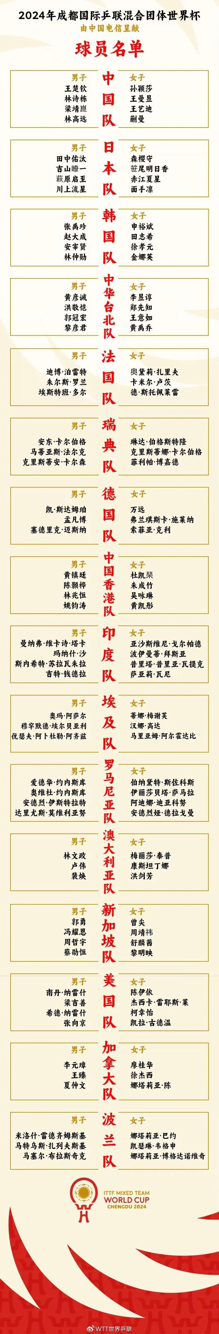 北京时间11月11日,2024年成都国际乒联混合团体世界杯各队参赛名单公布,中国队由王楚钦、林诗栋、梁靖崑、林高远、孙颖莎、王曼昱、王艺迪、蒯曼8名球员组成;而日本队、法国队没有派主力参赛。