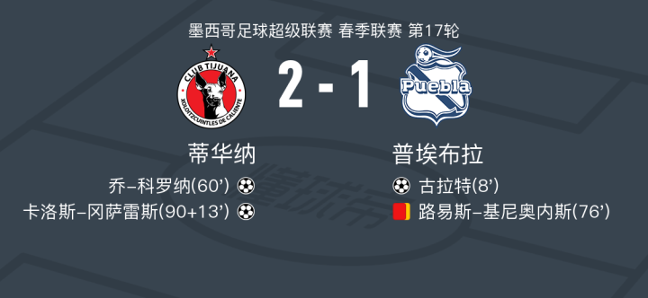 在墨西哥足球超级联赛春季联赛第17轮的比赛中,蒂华纳坐镇主场迎战普埃布拉。比赛中,普埃布拉的古拉特率先破门,为球队取得领先。随后,蒂华纳的乔-科罗纳接到队友的精妙传球,将比分扳平。比赛接近尾声时,卡洛斯-冈萨雷斯在队友的助攻下打入制胜一球。普埃布拉的路易斯-基尼奥内斯在比赛中被罚下,给球队带来不小的压力。最终,蒂华纳以2-1战胜普埃布拉,取得了这场比赛的胜利。