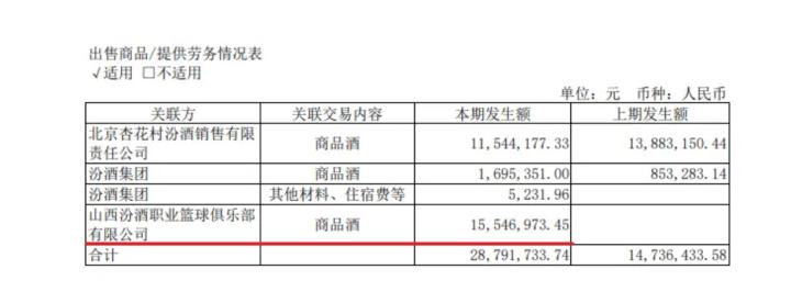 为哪般?财中社:山西汾酒上半年向山西男篮销售了1555万元商品酒