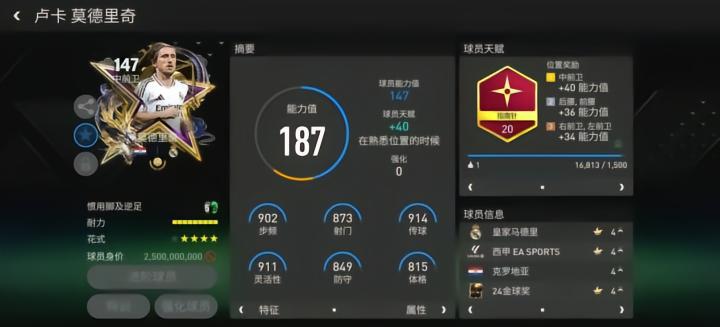 至尊球员莫德里奇司职中前卫,配备了指南针天赋,对他的加速、射门力量、盘带、控球、敏捷五项数据有所提升,这让他在实战中的持球手感和速度表现都有提升。花式方面,基础花式高级油炸丸子搭配四星花式星级让莫德里奇的中场摆脱效率大大提升。