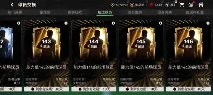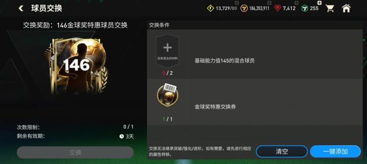 今天更新后,146金球奖特惠球员交换上线,使用两名145能力值的混合球员,1张金球奖特惠交换券可以交换获取一名146能力值金球奖球员。