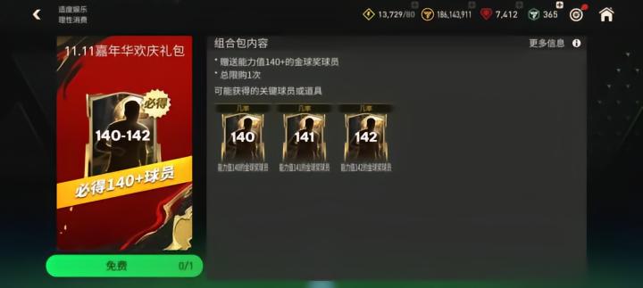 登陆游戏进入商城界面,可以免费领取基础能力值140-142的金球奖球员一名。