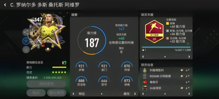 至尊球员C罗司职前锋,配备了强力锋霸天赋,对他的加速、射门、抢点、头球、力量五项数据提升显著,同样是显著提升了他的锋线终结能力。花式方面,高达五星的花式星级搭配马赛回旋基础花式,C罗的持球突破能力非常出色。