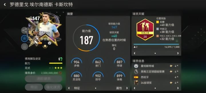 至尊球员罗德里司职后腰,配备了叹息之墙天赋,对他的加速、人盯人、铲断、拦截、侵略性五项数据提升显著,这让他在实战中的防守表现更加稳定。花式方面,尽管花式星级只有三星,但是基础花式配备高级油炸丸子后,罗德里的盘带突破能力值得信赖。
