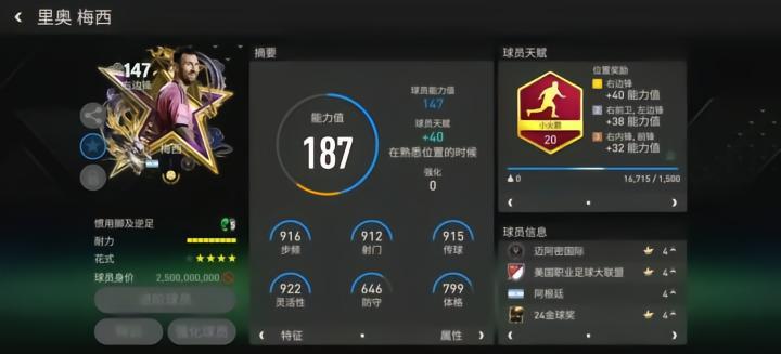 至尊球员梅西司职右边锋,配备了小火箭天赋,对他的冲刺速度、远射、传中、盘带、控球五项数据提升显著,这让他在实战中的边路冲击力和内切得分能力更加犀利。花式方面,五星花式星级搭配高级油炸丸子的配置保障了梅西的持球进攻能力。