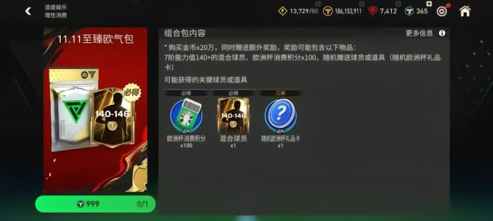 使用999点券可购买一次11.11至臻欧气包,保证获得1张7阶的基础能力值140-146混合球员。