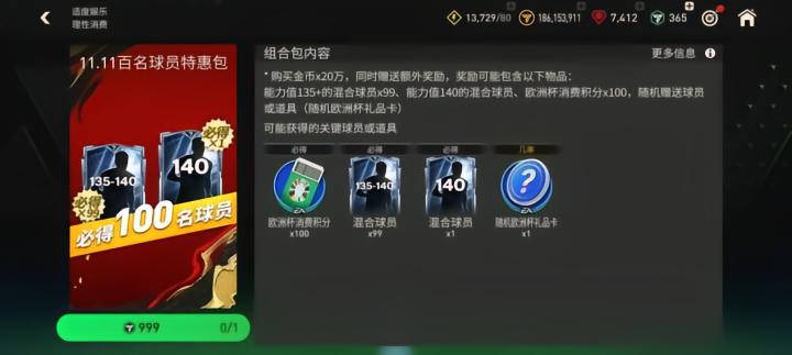 使用999点券可购买一次11.11百名球员特惠包,保证获得1张140能力值球员卡,并能获得99张135-140能力值球员卡。