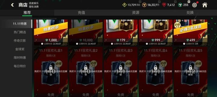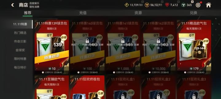 使用10、100、1000、10000点券可购买11.11特惠秒杀包,分别能获得基础能力值139、140、141、142的球员卡奖励。