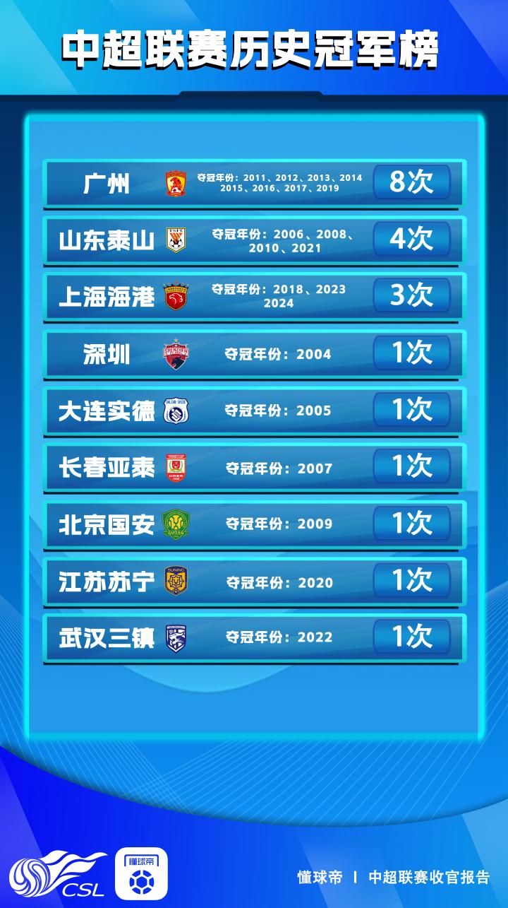在赛季正式收官的时刻,懂球帝《2024赛季中超收官报告》也正式上线,让我们来看看中超历史冠军次数榜吧!