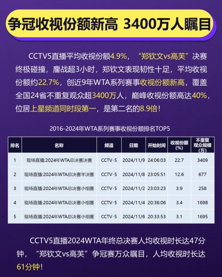 北京时间11月10日,WTA年终总决赛由中国选手郑钦文对阵美国选手高芙,经过3个小时的鏖战,郑钦文1-2遗憾不敌高芙,收获亚军。这场比赛央视收视率(仅CCTV5,不包括移动端)爆棚:平均收视份额22.7%,覆盖不重复观众约3400万人,位居上星频道同时段第一,是第二名的8.9倍。