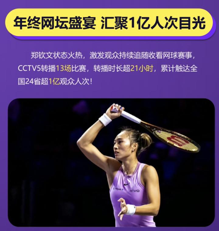 收视火爆!郑钦文年终决赛超3400万人观看,收视率居同时段第一