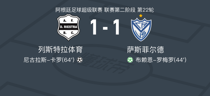 在阿根廷足球超级联赛第二阶段的较量中,列斯特拉体育坐镇主场迎战萨斯菲尔德。比赛中,萨斯菲尔德的布赖恩-罗梅罗通过点球为球队先拔头筹。随后,列斯特拉体育的尼古拉斯-卡罗在巴里奥努埃沃的助攻下扳平比分。最终,双方以1-1握手言和。