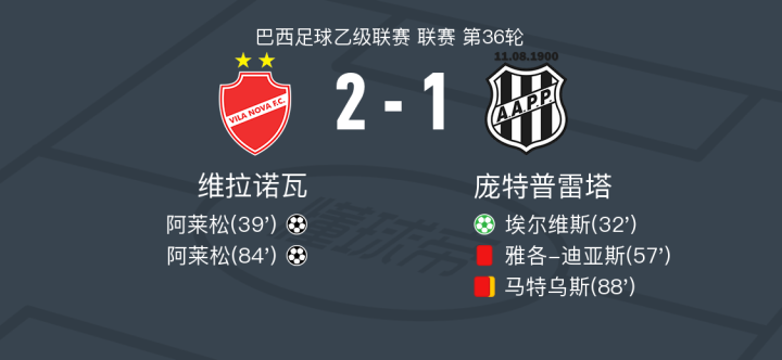 在巴西足球乙级联赛第36轮的较量中,维拉诺瓦坐镇主场迎战庞特普雷塔。比赛中,庞特普雷塔的埃尔维斯通过点球为球队首开纪录。随后,维拉诺瓦的托迪尼奥-儒尼奥尔送出精妙助攻,阿莱松成功破门,为主队扳平比分。 比赛进入下半场,庞特普雷塔的雅各-迪亚斯被罚下场,给球队带来了不小的压力。维拉诺瓦抓住机会,加布里埃尔-席尔瓦再次助攻阿莱松,后者完成梅开二度,帮助球队反超比分。比赛接近尾声时,庞特普雷塔的马特乌斯因累计黄牌被罚下,球队再遭打击。 最终,维拉诺瓦凭借阿莱松的两粒进球,以2-1战胜庞特普雷塔,取得了本场比赛的胜利。