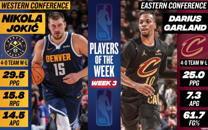 北京时间今日,NBA官方公布了上一周东西部周最佳球员,克利夫兰骑士队的达里厄斯-加兰和丹佛掘金队的尼古拉-约基奇分别当选。