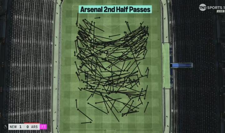 比赛的结果令人失望,过程同样槽点满满。造访圣詹姆斯公园,阿森纳只有1脚射门命中目标,追分阶段甚至都无法将球传入禁区;做客梅阿查,阿森纳送出了9倍于对手的传中(46-5),却只有10次找到队友,20次射门有半数被国米后卫封堵;客场对阵切尔西,阿尔特塔的球员7次掉进越位陷阱,4次绝佳机会只换来1粒进球。