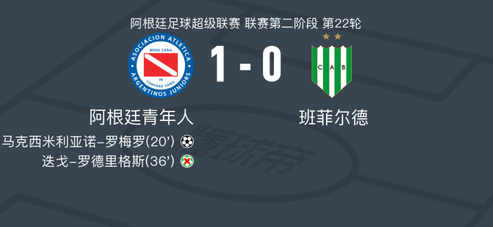 在阿根廷足球超级联赛第二阶段的较量中,阿根廷青年人坐镇主场迎战班菲尔德。比赛中,阿根廷青年人的马克西米利亚诺-罗梅罗在队友霍纳坦-加尔万的助攻下成功破门,为球队取得领先。尽管迭戈-罗德里格斯未能把握住点球机会,但阿根廷青年人依然凭借这粒进球,以1-0小胜班菲尔德,捍卫了主场荣耀。