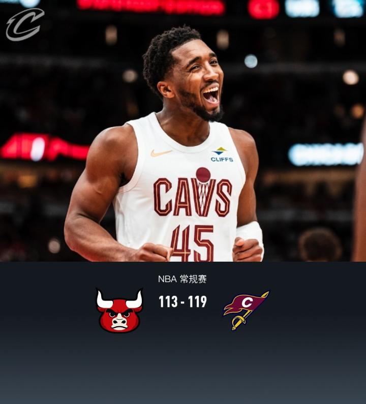骑士119-113公牛取NBA12连胜,米切尔36+8+2