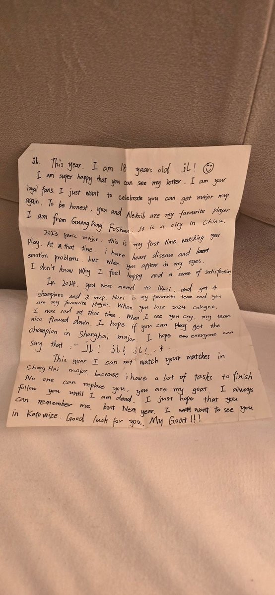 粉丝来信原文:今年我18岁了,jL!我很开心你能看到我的信,我是你的忠实粉丝。我只是希望你能再次拿到Major的MVP。说实话,你和Aleksib都是我最爱的选手。我来自广东佛山,是中国的一座城市。