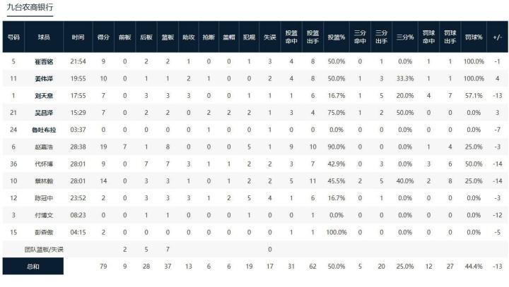 九台农商银行赵嘉浩19分8板,蔡林翰14分3板1助1帽,姜伟泽10分1板2助1断;
