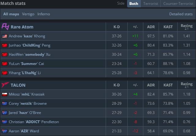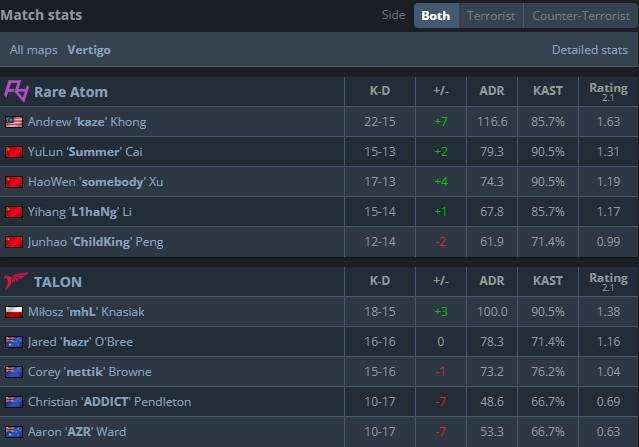 下半场Talon赢下手枪局,但RA完成eco翻盘,此后一度以10-6占先。但TALON马上追回两分,比赛来到第19回合,RA进攻B区,kaze一波五杀拯救RA!第21回合,又是kaze完成了1v3守包,RA收下图一,赢下了CNCS的梦魇Vertigo!
