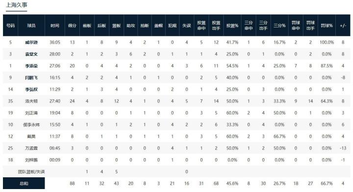 上海久事这边,洛夫顿得到22分12板4助,李添荣20分4板2助;