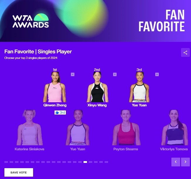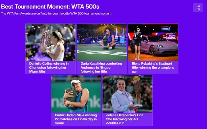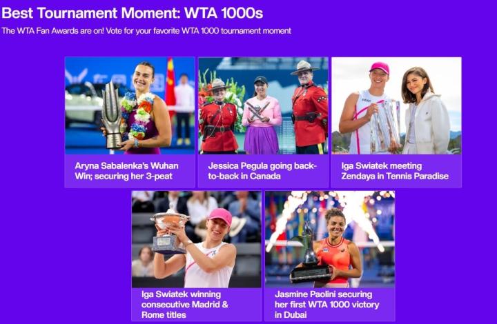 北京时间11月13日,2024赛季WTA年度奖项球迷评选正式开启。本次评选共包括最受球迷欢迎的单打球员、最受球迷欢迎的双打球员、WTA1000赛最佳时刻、WTA500赛最佳时刻、WTA250赛最佳时刻、和球迷互动最佳时刻、赛场最搞笑时刻共计7个奖项。