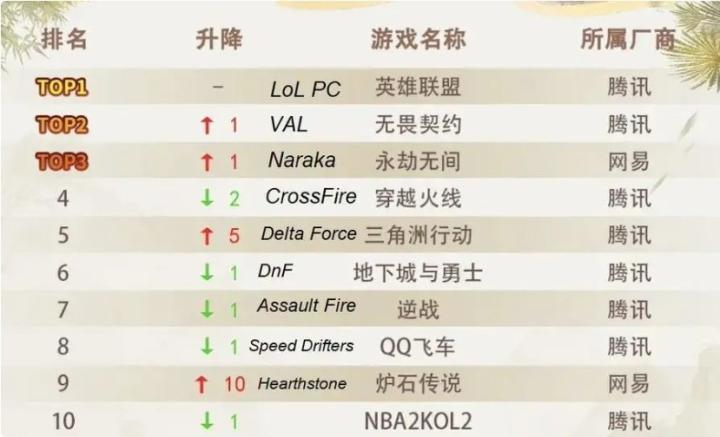 列表中的第二名是另一款来自Riot Games的游戏——Valorant,而第三名则是一款中国的大逃杀游戏《永劫无间》。前十名中还包括了《穿越火线》、《炉石传说》等其他游戏。